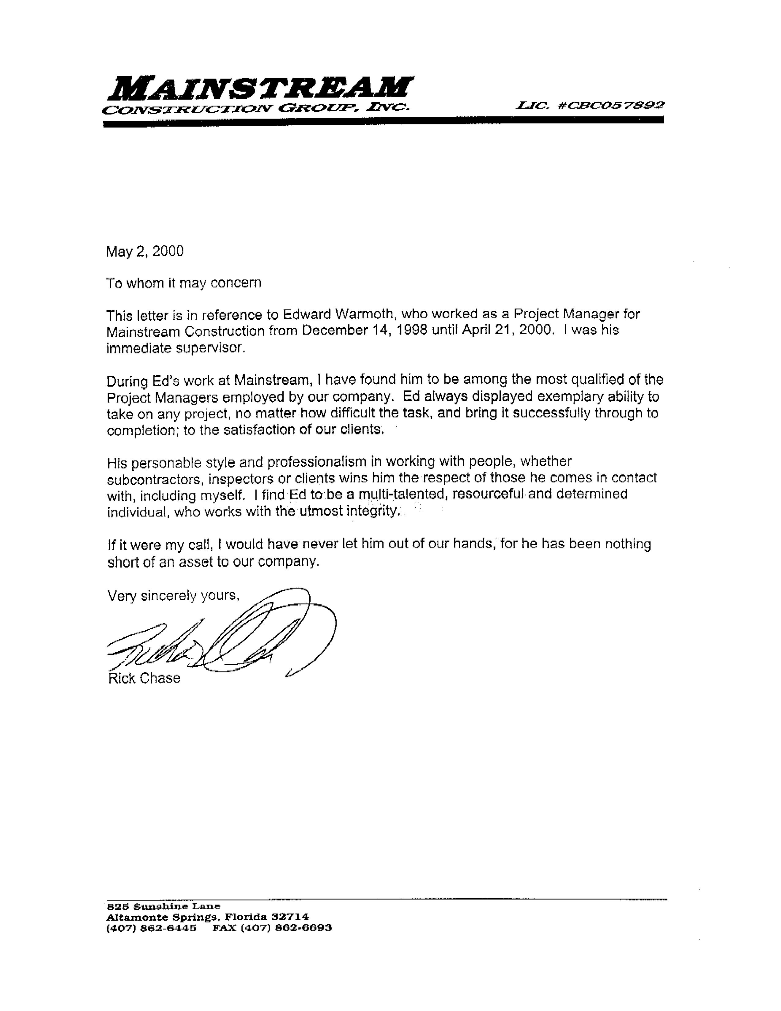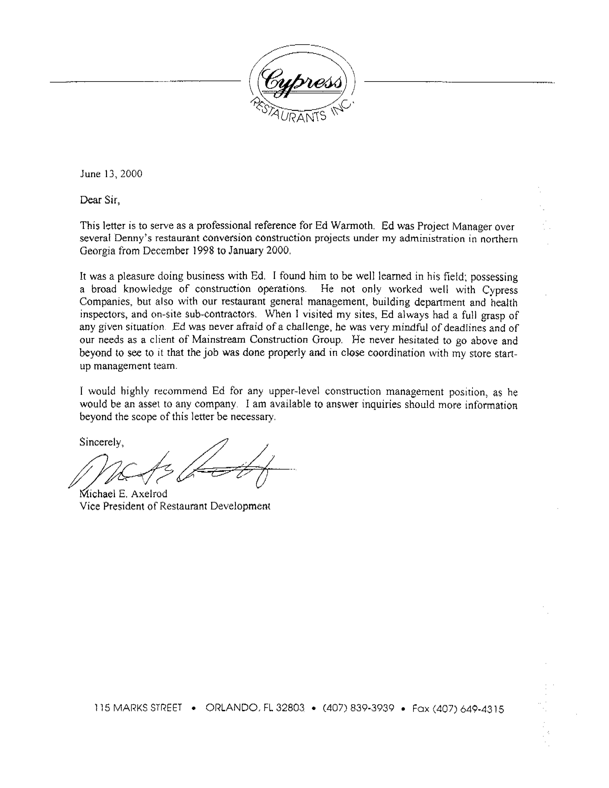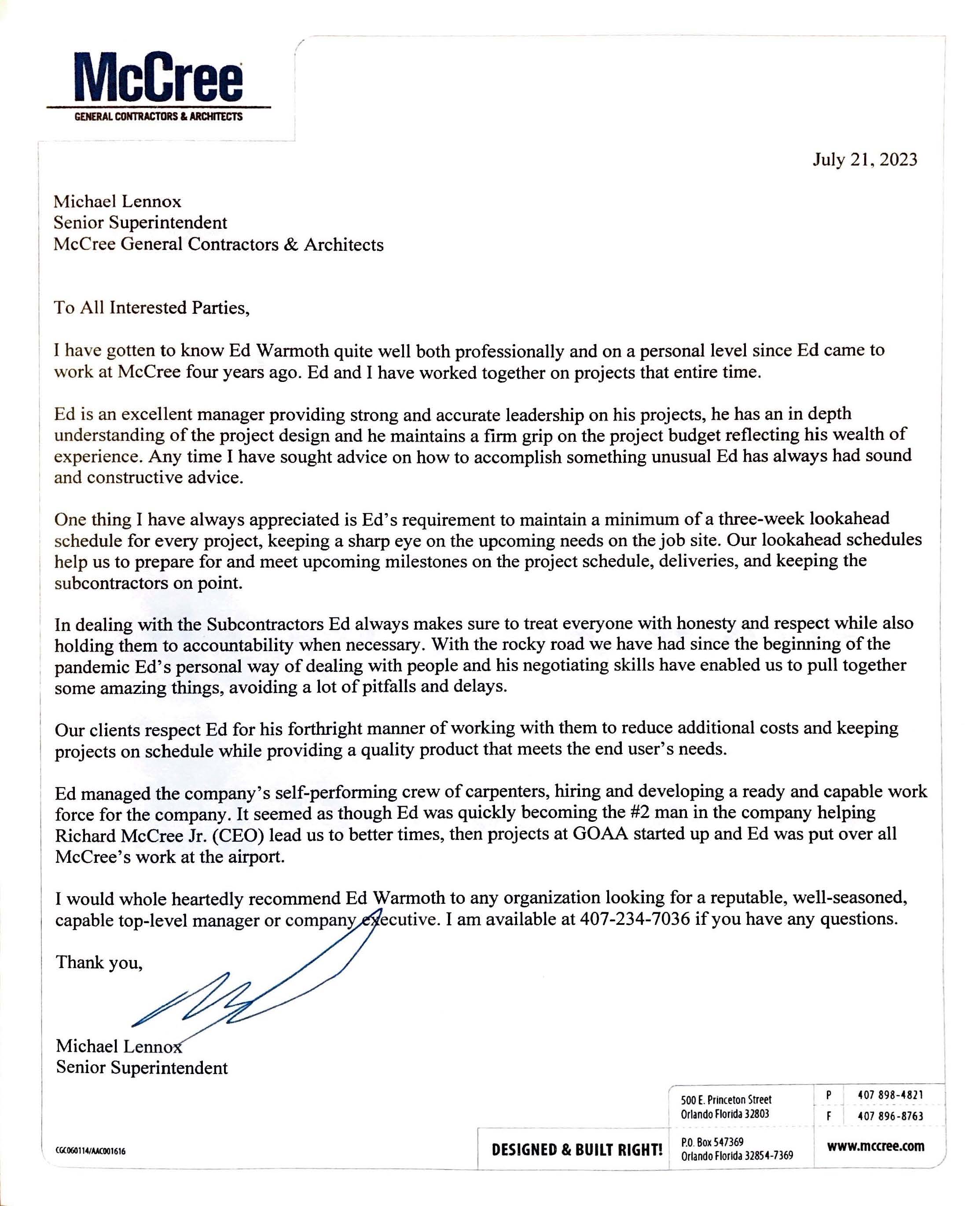Edward Warmoth has had the great fortune to work with an assortment of well-known companies, build relationships with distinguished colleagues, and complete some remarkable projects. Below are letters from clients, co-workers, and industry colleagues — spanning recent years through the early part of his career. These are their words. Click any letter to view it full size.